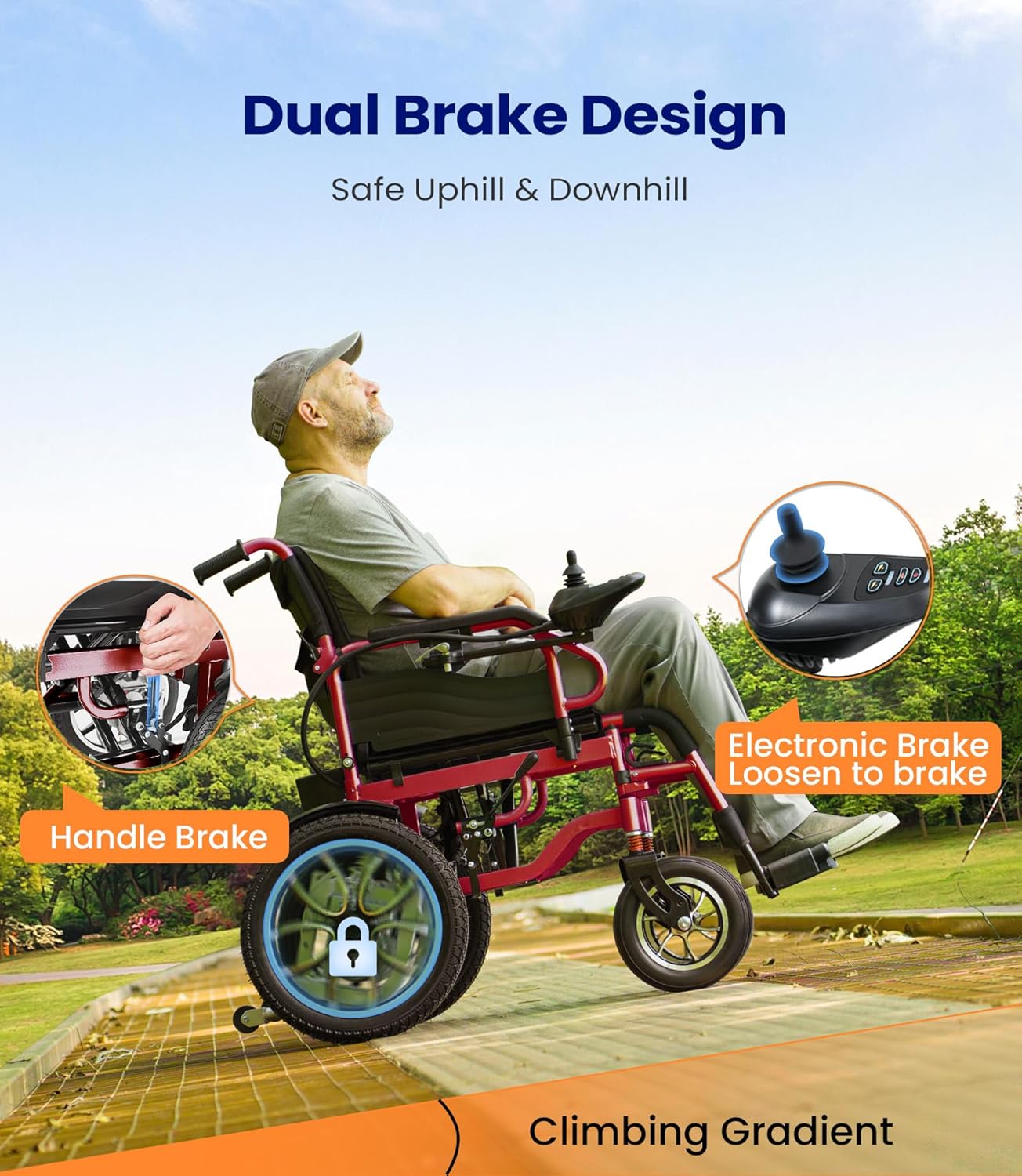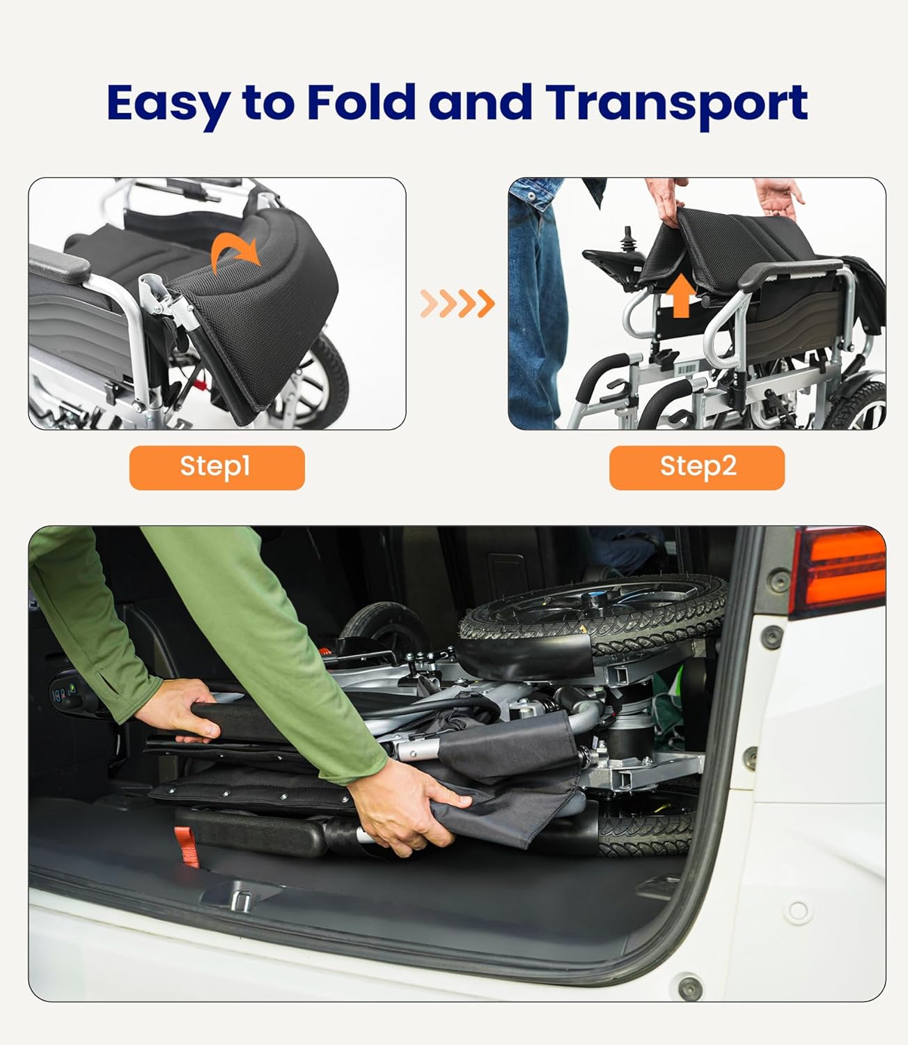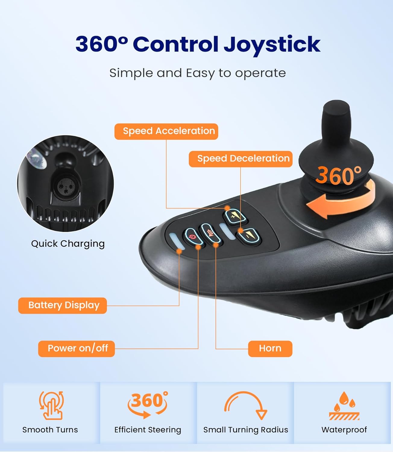 Le joystick intelligent à 360° vous permet de tourner et de freiner facilement dans les espaces restreints, avec un réglage à 5 vitesses et une vitesse maximale de 6 km/h. Le klaxon supplémentaire assure un déplacement en toute sécurité. Le fauteuil roulant pèse 34,35 kg. Facilement pliable, il mesure 78 x 40 x 72 cm et se range facilement dans la plupart des coffres.