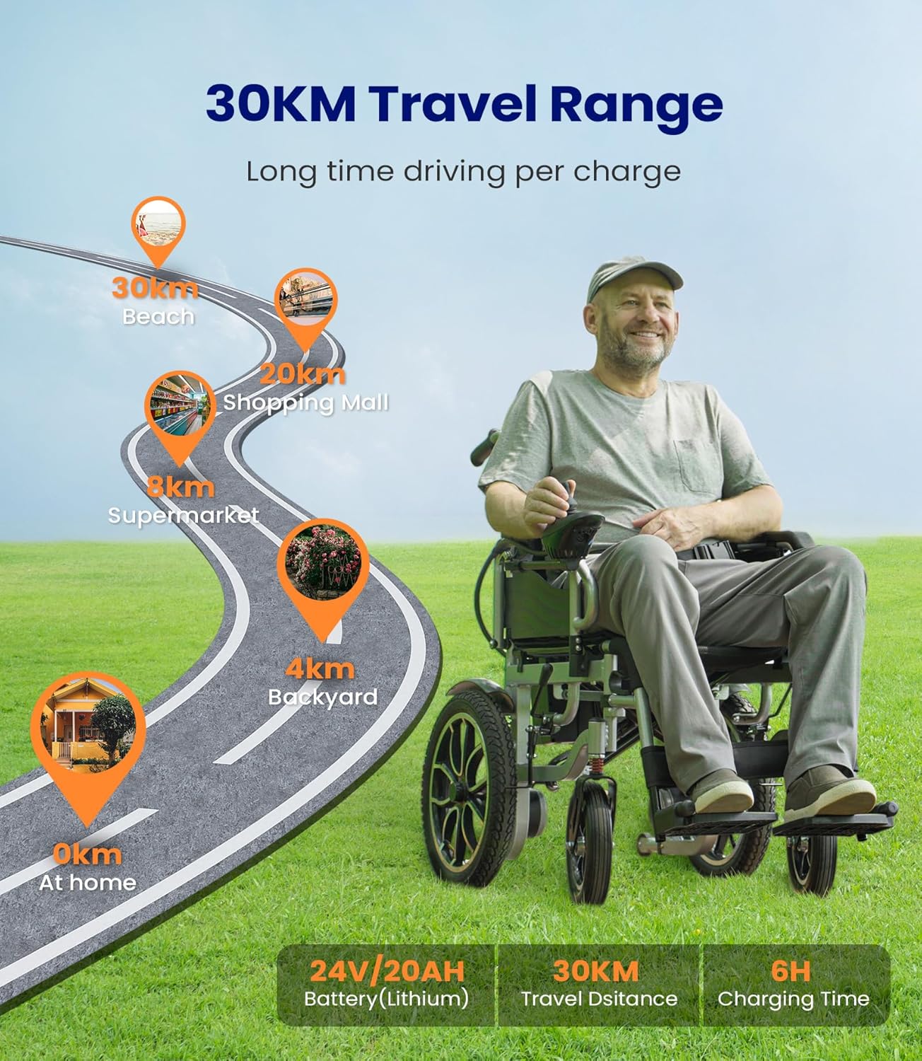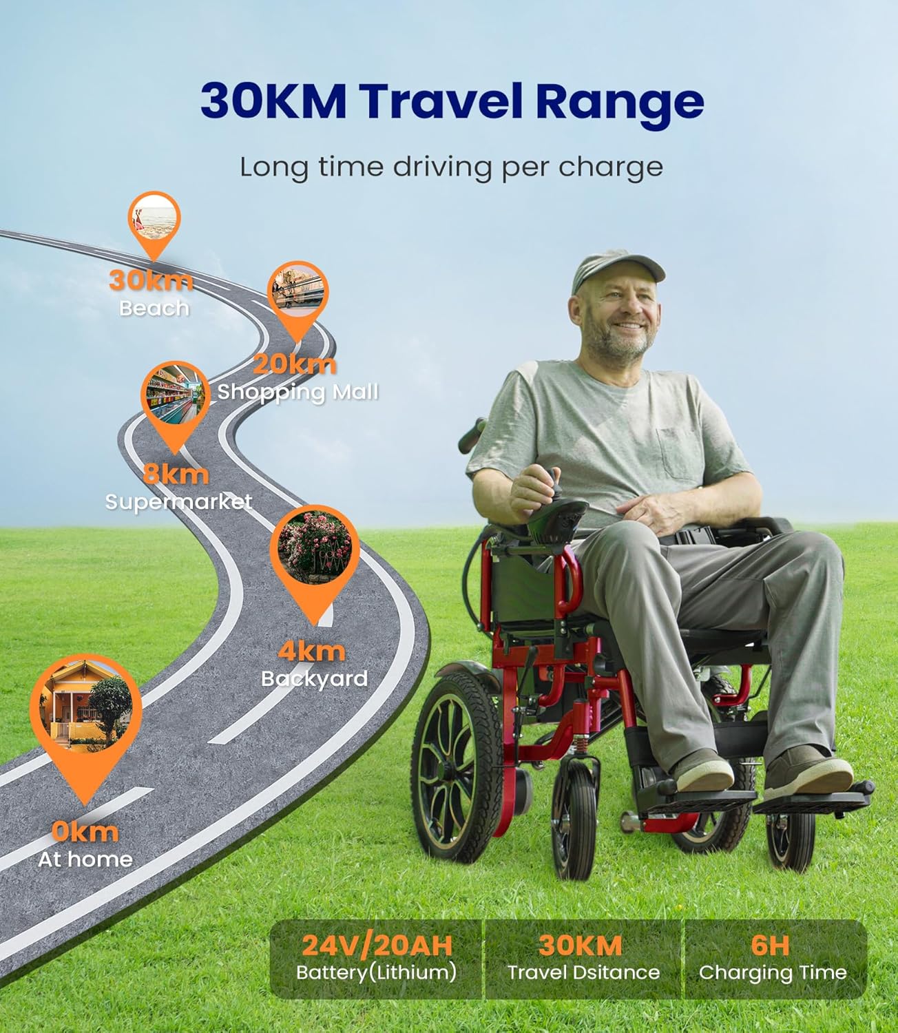 Le VOCIC V56 est équipé d'une batterie lithium haute performance (24 V/20 Ah). C'est le fauteuil roulant électrique offrant la plus grande autonomie du marché. Avec une autonomie ultra-longue de 30 km, vous pouvez aller partout. Vitesse de pointe : 6 km/h. Équipé d'un puissant moteur de 500 W, il offre une autonomie exceptionnelle et vous permet d'affronter facilement divers types de terrains, comme les pentes et les obstacles.
