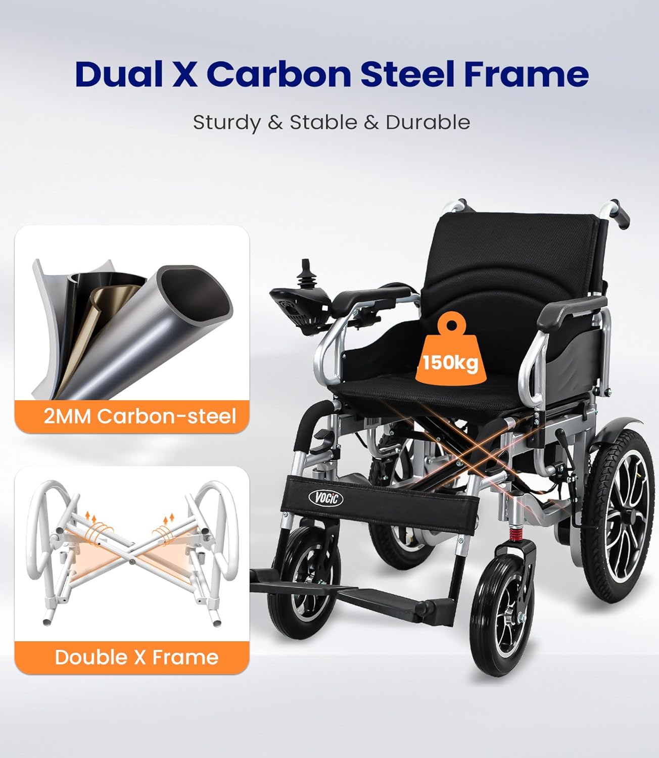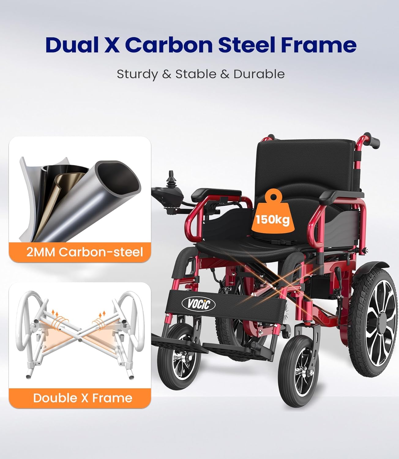 Der Elektrorollstuhl besteht aus hochwertigem Kohlenstoffstahl,der langlebiger ist.Der Gesamtrahmen besteht aus einem Doppel-X-Rahmen,der nicht leicht zu schütteln ist.Im Vergleich zum herkömmlichen flachen Design kann die Stabilität auch auf extrem unebenem Boden aufrechterhalten werden.Max Tragfähigkeit:150kg. 4cm dicke und atmungsaktive Polster bietet besseren Halt und verursacht bei längerem Sitzen keine Wundliegen. Das Pad ist zur einfachen Reinigung abnehmbar