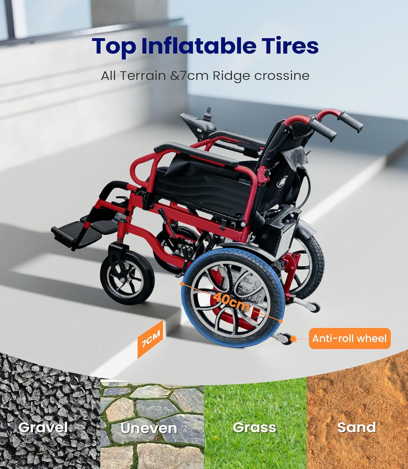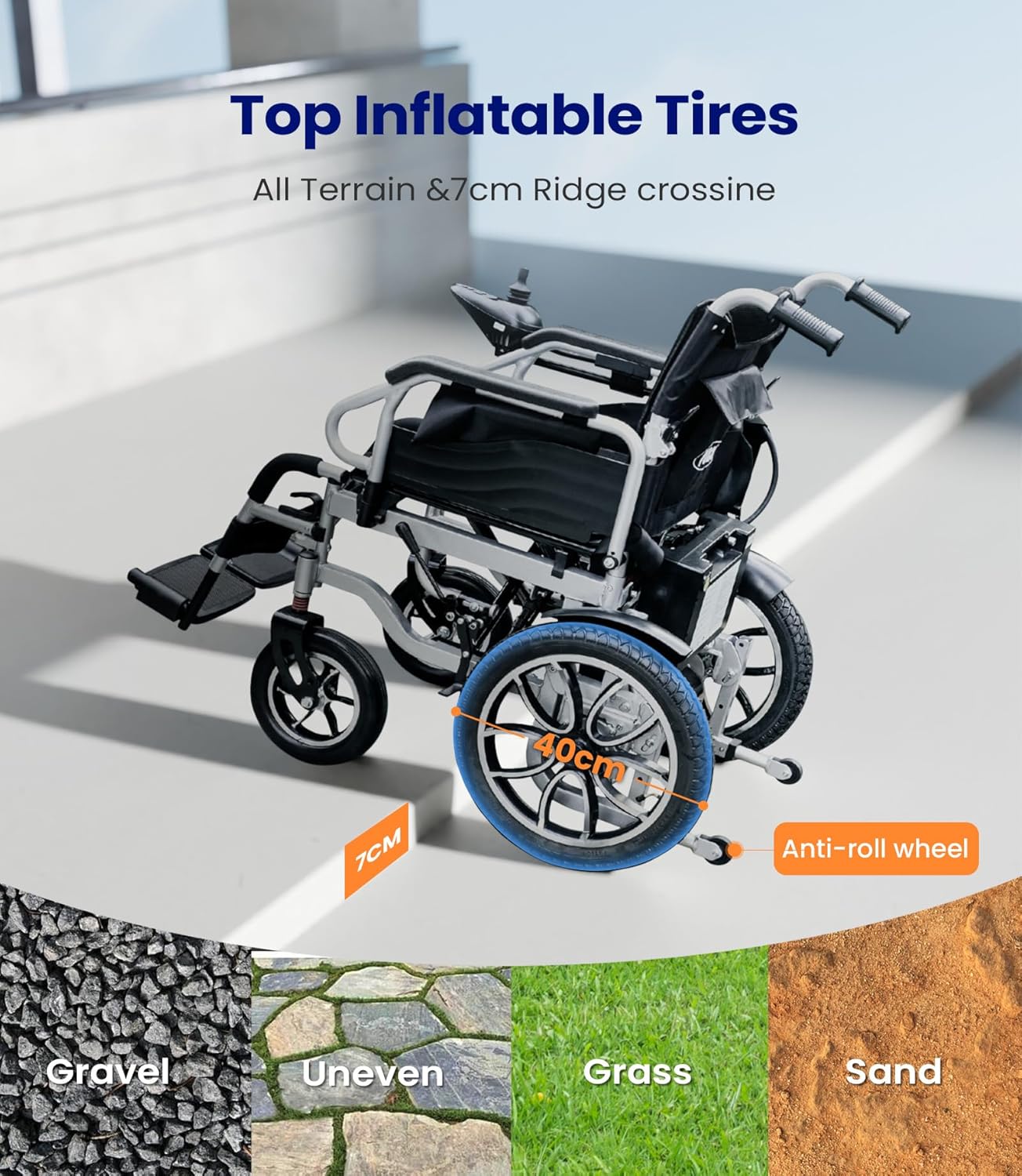 Nous utilisons des roues arrière gonflables en caoutchouc de haute qualité pour une excellente absorption des chocs et une excellente résistance à l'usure, vous permettant de rouler aisément sur divers terrains, comme l'herbe et le gravier. Des pneus extra-larges de 40 cm vous permettent de franchir des obstacles jusqu'à 7 cm de haut avec plus d'aisance qu'avec des pneus étroits classiques. Cela garantit une adhérence stable et sûre lors des déplacements en extérieur.
