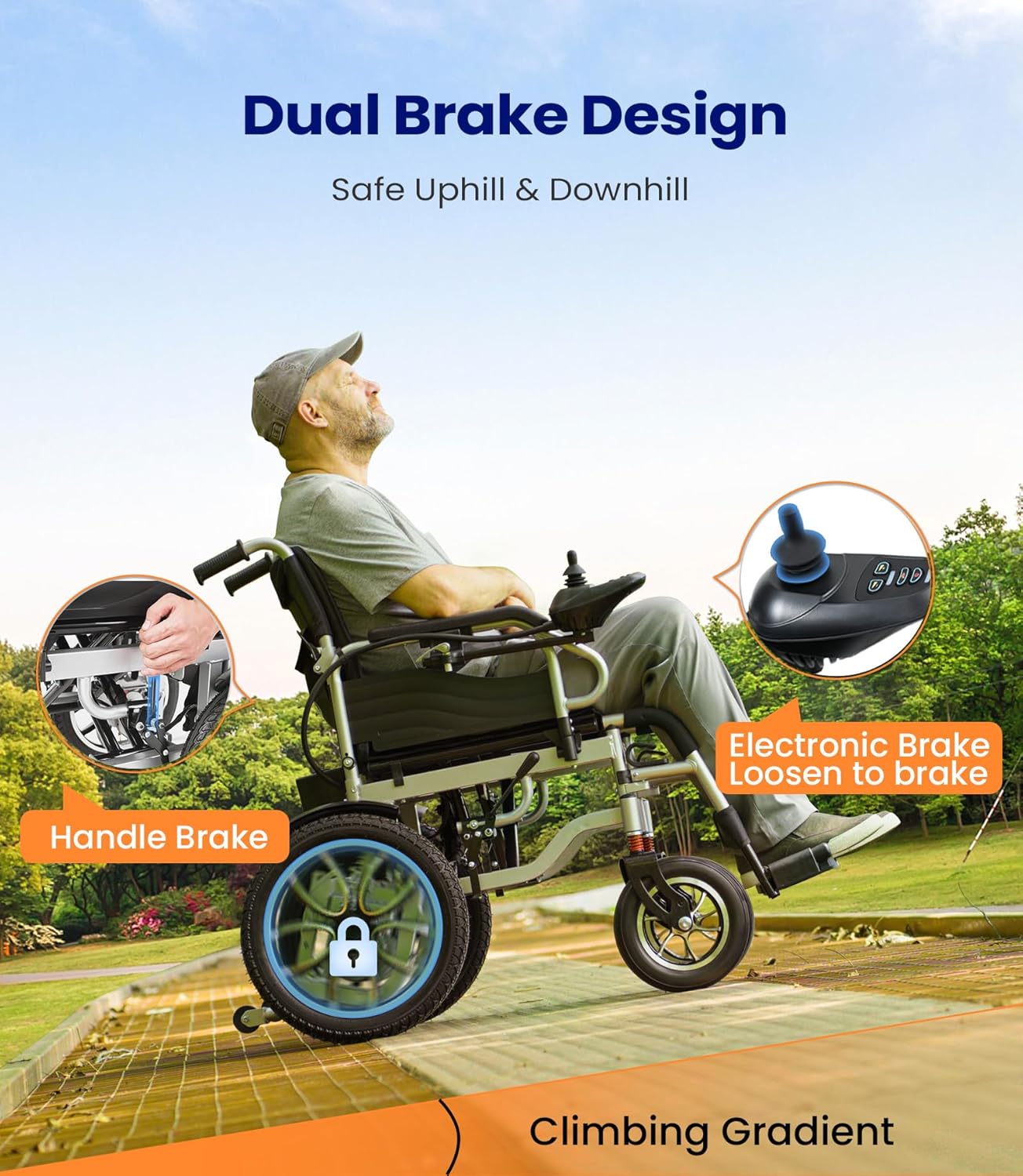 Un système de freinage électronique sensible assure une conduite sûre en montée comme en descente, d'un simple relâchement du joystick. Associé à un frein à main, il offre une double protection. Équipé de quatre ressorts amortisseurs, il assure une conduite souple et confortable. Des ceintures de sécurité supplémentaires et des roues stabilisatrices renforcent la sécurité pendant le transport.